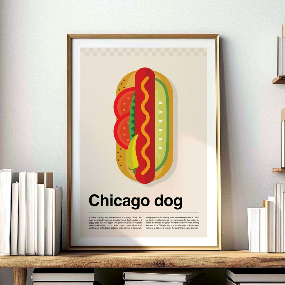 This "Chicago Dog" design combines minimal decor with an iconic Chicago food classic. Its modern typography and retro vibe make it a standout piece, even featuring fun facts about the beloved dish.